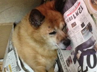 上にかかってる新聞紙は、今朝急に寒くなったからのママさんの心遣いです(笑)